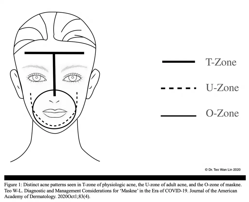 Diagnosis of Maskne: Dr. Teo Wan Lin, the first dermatologist to publish a white paper on maskne, proposes the first clinical criteria for the diagnosis of maskne in her research letter. She characterizes the region as the ‘O-zone’, a visual representation of the area the face mask covers.